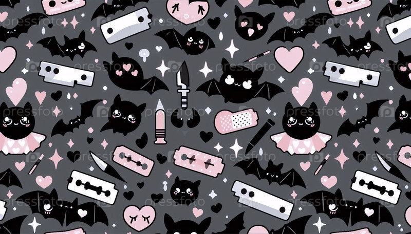 Готический шаблон кавайи из милых летучих мышей и крестов, Ai generated image