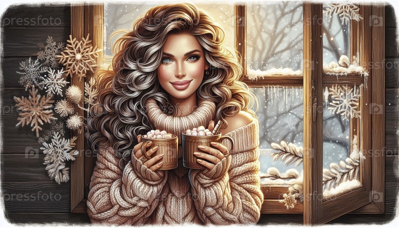 Пин-ап девушка в уютном свитере, держащая две чашки горячего какао, Ai generated image