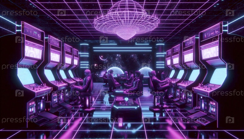 Ретро-футуристическая аркада со светящимися голографическими играми и капсулообразными сидячими каютами, Ai generated image