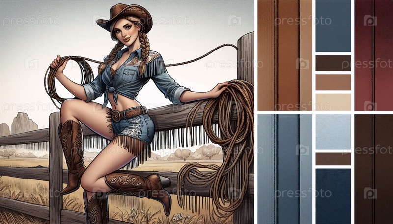 Пин-ап девушка как ковбойка с лассо, опираясь на столб ограждения, Ai generated image