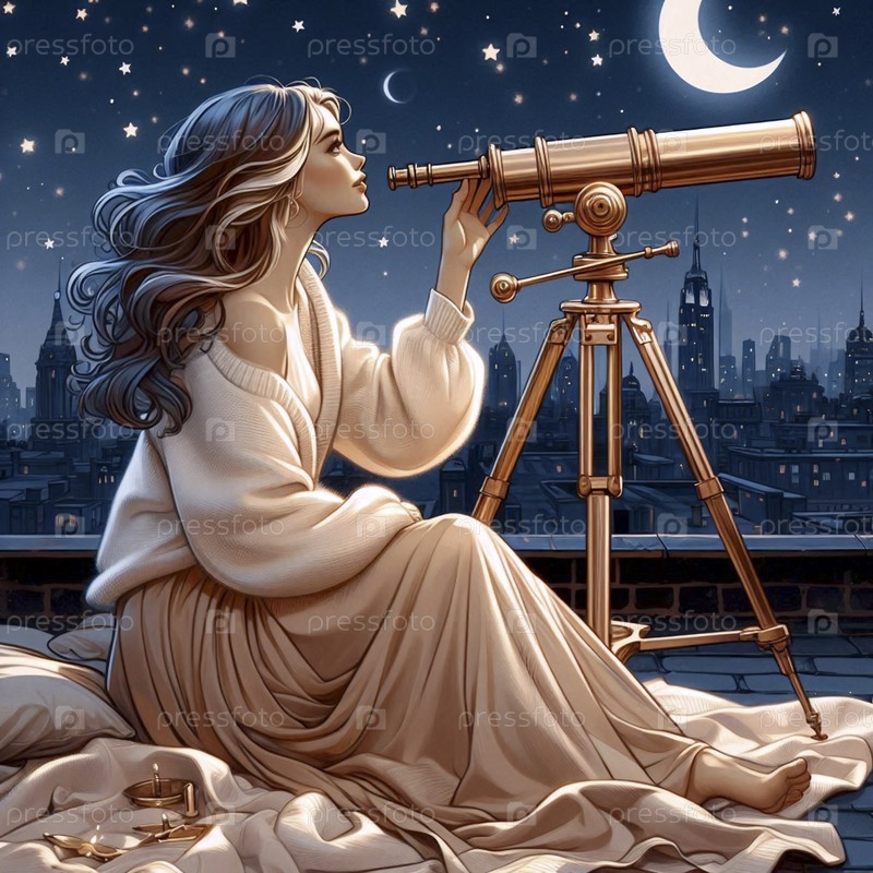 Пин-ап девушка с телескопом, наблюдающая за звездами со крыши дома, Ai generated image