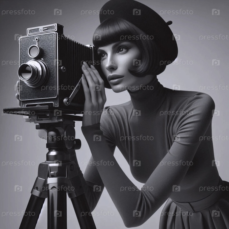Пин-ап девушка с винтажным фотоаппаратом, фотографирующая себя, Ai generated image