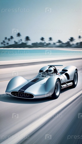 Трехколесный Jetcar с входом турбинового двигателя и одним задней крышкой, ускоряющийся по береговому шоссе, Ai generated image