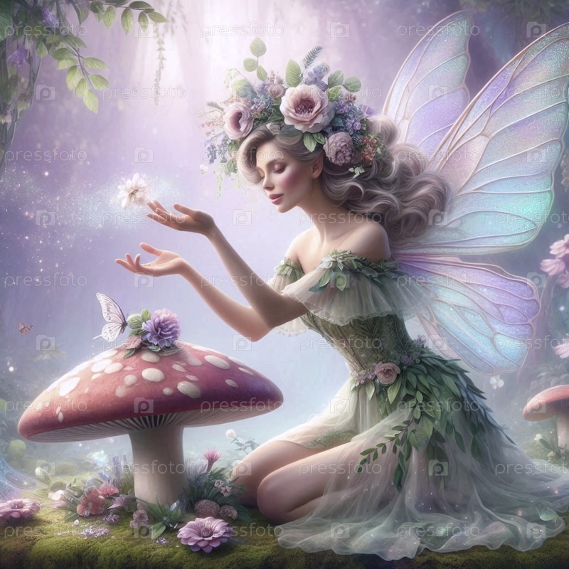 Пин-ап девушка, одетая как фея с крыльями бабочки в саду, Ai generated image
