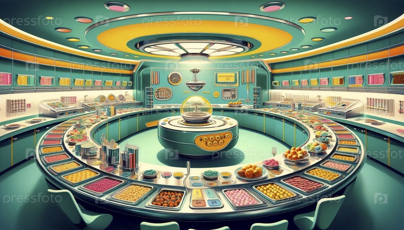 Винтажная кухня будущего с центральной консолью управления и автоматическими приборами для доставки пищи, Ai создал изображение