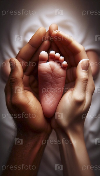 Рука новорожденной матери переплетается с рукой ее партнера, оба нежно держат крошечную ножку своих новорождённых детей, Ai generated image