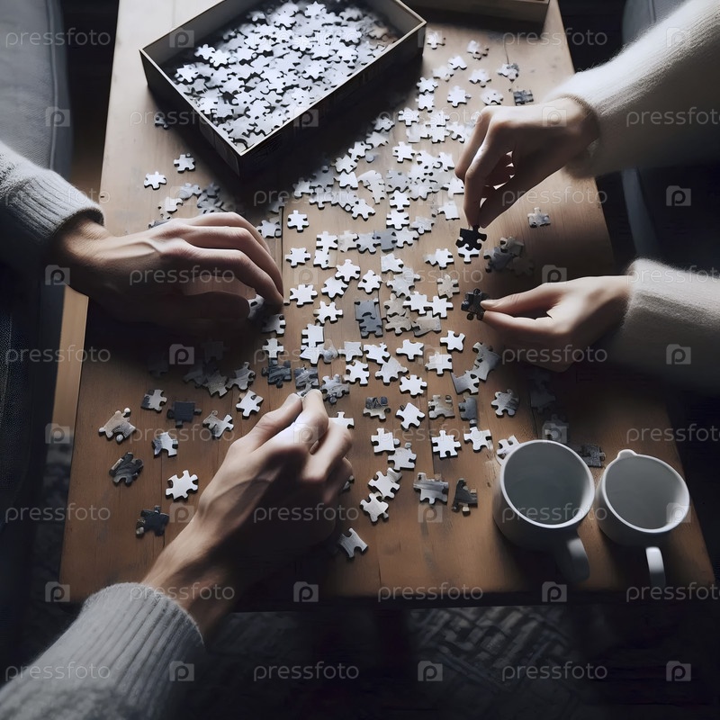 Пара, строящая вместе головоломку в дождливый воскресной день днем, их руки встречаются посередине, Ai создал изображение