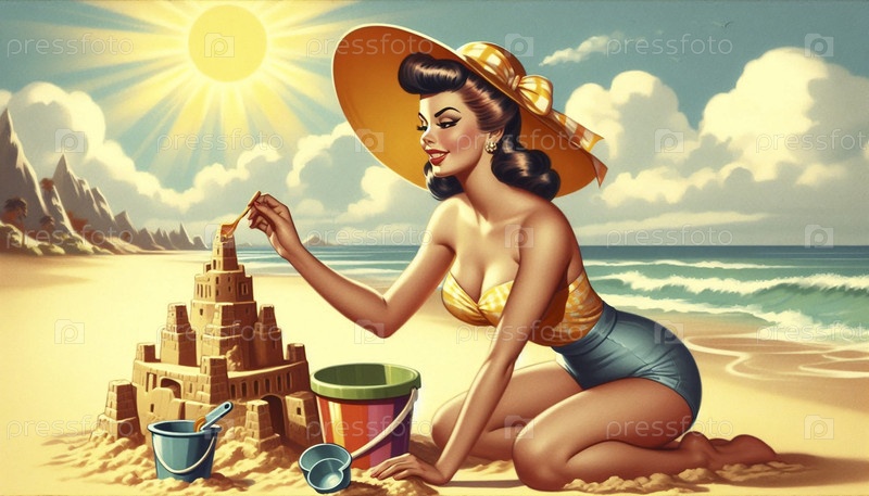 Пин-ап девушка в купальнике строит песчаный замок на пляже, Ai generated image