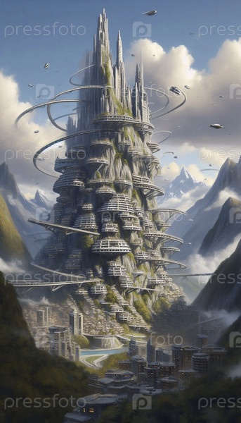 Огромный многоэтажный мегагород, построенный в сторону горы, связанный воздушными трамваями и спиральными дорогами, Ai создал изображение