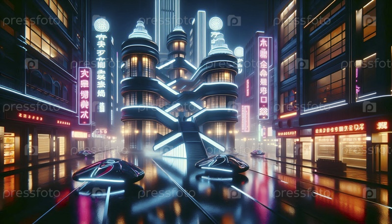 Дождливая улица, освещенная неоновыми огнями в ретро-киберпанкском городе с сильным влиянием Art Deco, Ai generated image