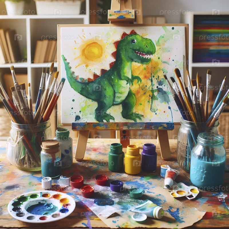 Творческая художественная станция: небольшая эстафета с красочной живописью, банки кистей и разлитые акварели, Ай создал изображение