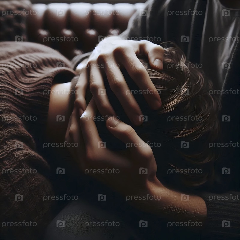 Партнер утешает другого в течение минуты тихого скорби, рука опирается на склоненную голову, Ai создал изображение