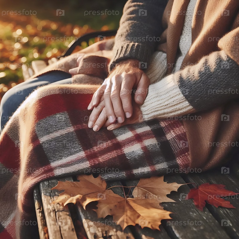 Пожилая пара, сидящая на скамейке в парке с объединенными руками на общем одеяле, Ai generated image