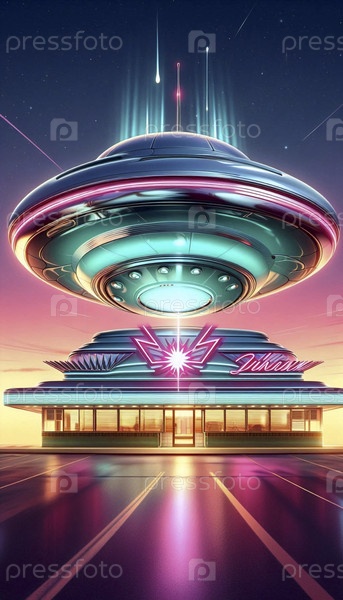 Утонченная летающая тарелка атомного возраста, летящая над рестораном в стиле Googie на закате, Ai generated image