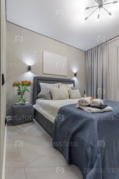 Стильный интерьер спальни с серой мягкой кроватью с белыми подушками и синим постельным покрытием. свежие оранжевые цветы в вазе и складываемые полотенца добавляют приветственный оттенок современной комнате с мягким освещением