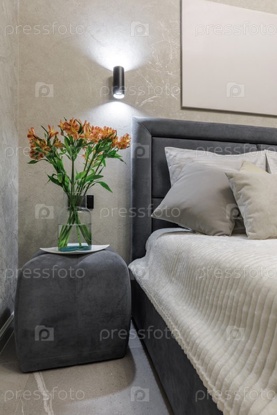 Уютная деталь спальни с серой мягкой кроватью с белыми постельными принадлежностями и подушками.Стеклянная ваза с оранжевыми цветами сидит на соответствующем сером османском рядом с минималистической стенной лампой и текстурированной стеной
