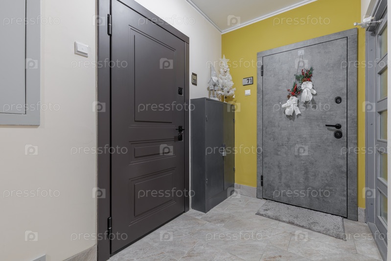 Сцена включает в себя две стильные серые двери безопасности, ярко-желтую акцентную стену и шкаф для коммунальных услуг, украшенный белой рождественской елкой