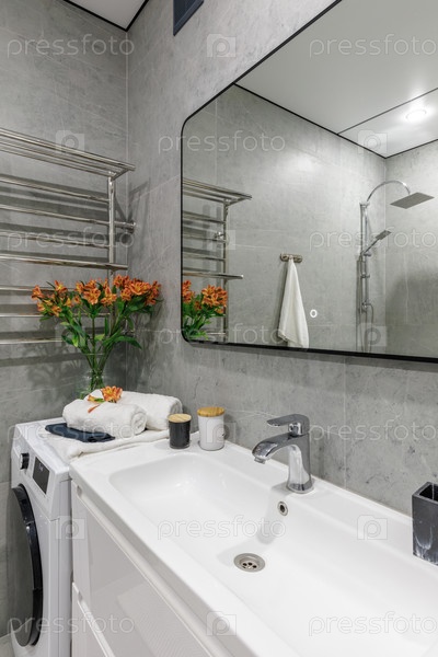 Яркая, современная ванная комната с белой раковиной и стиральной машиной со свежими полотенцами и апельсиновыми цветами наверху