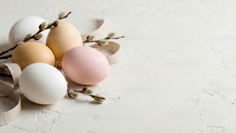 Пастельные пасхальные яйца с лентой и ветвями верби на столе