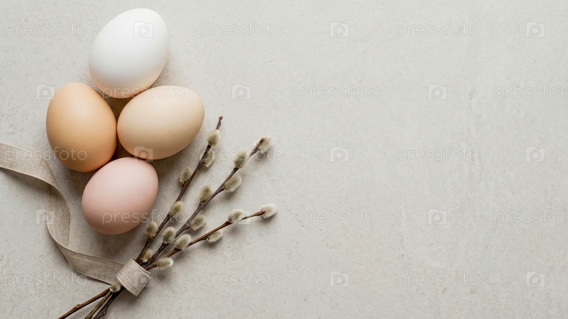Пастельные пасхальные яйца с лентой и ветвями верби на столе