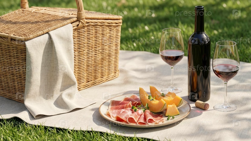 Настройка пикника с вином и дыни на одеяле на открытом воздухе