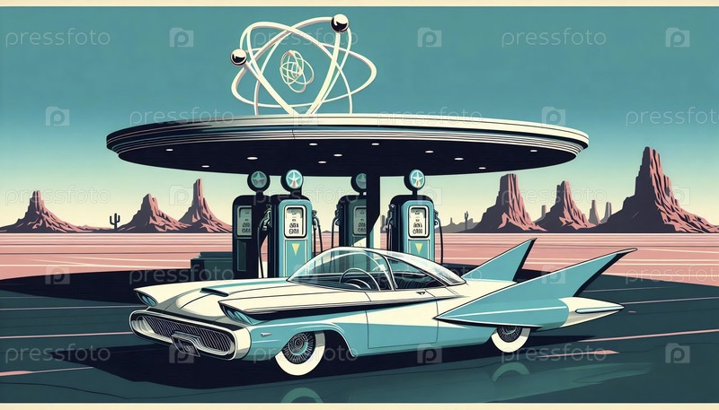 Упрощенный атомный автомобиль с гигантскими хвостовыми плавниками, припаркованный на ретро-футуристической заправочной станции на пустынной шоссе Ai generated image