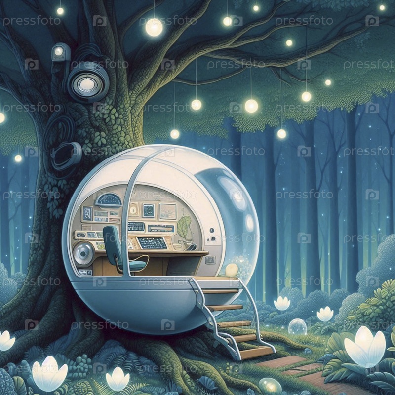 Уютный личный Study Pod, висящий на дереве в ретро-футуристической лесной среде обитания, Ai generated image