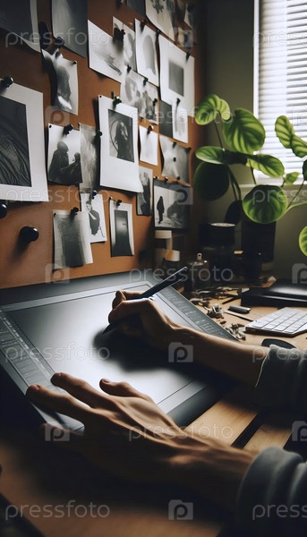 Креативные профессионалы сосредоточились на глубокой рабочей сессии в минималистической домашней студии, Ai создал изображение