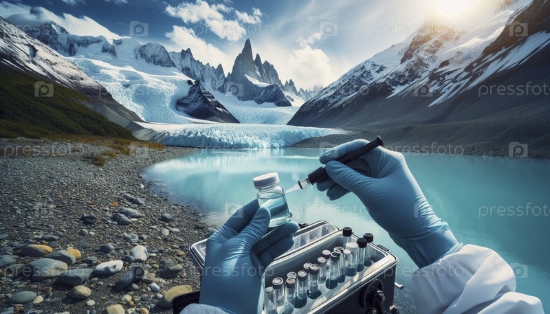 Команда ученых-экологов берет образец воды из нетронутой ледниковой реки, Ai generated image