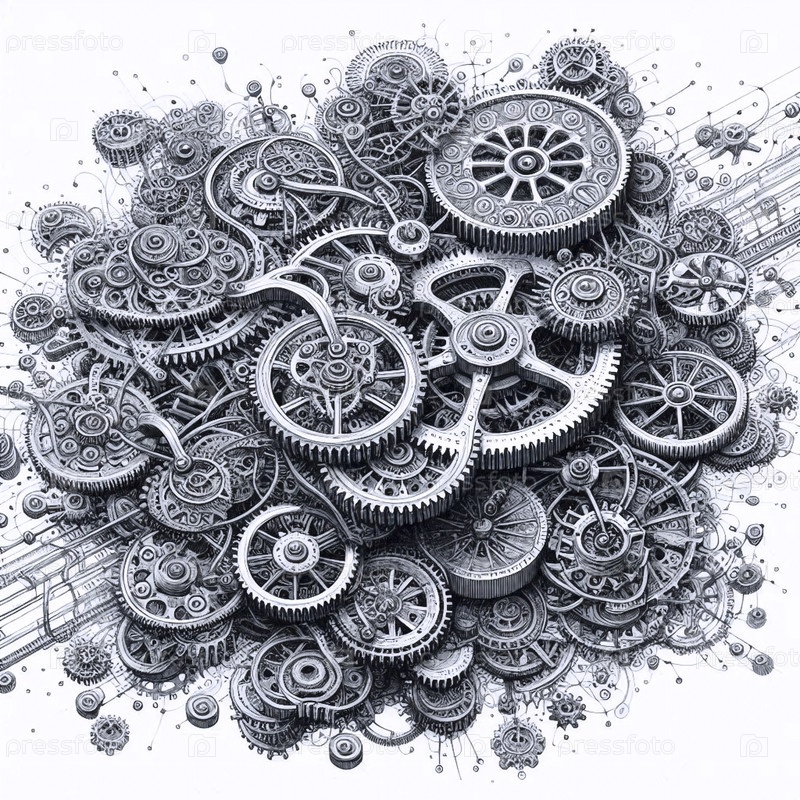 Steampunk Gears A ink drawing art print on black, Ai создал изображение