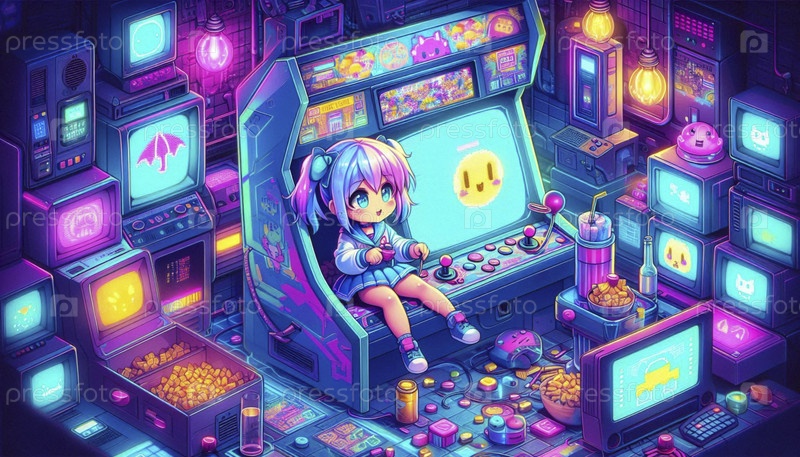 Подробная сцена кавайи в виртуальной аркаде, Ai generated image