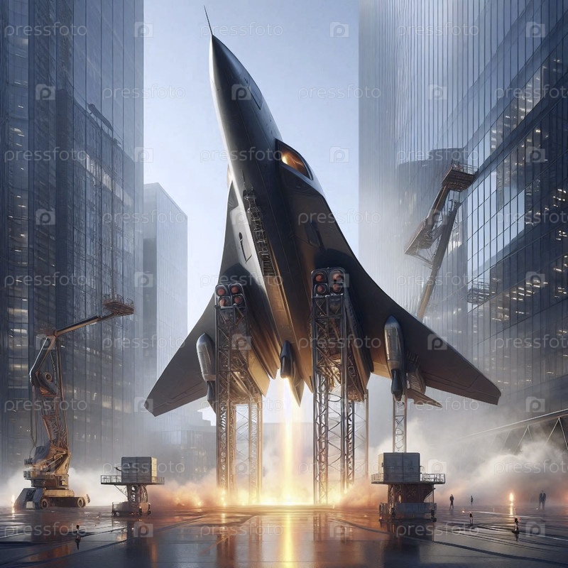Ракетный самолет в стиле DynaSoar с дельта-крыльями и иглой кабины пилотажа, запускающийся вертикально с столичной площадки, Ai generated image