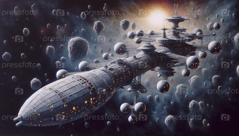 Массивный межзвездочный круизный лайнер из космоса: 1999 дрейфующий вблизи кристаллического поля астероидов, Ai generated image