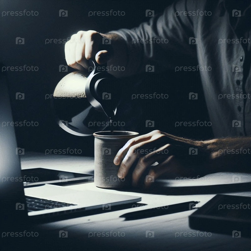 Устойчивые предпринимательские руки, слегка уставшие, но стойкие, наливают чашку кофе поздно ночью в минималистичном офисе, Ai generated image