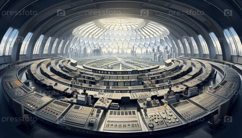 Панорамный диспетчерский зал ядерного города с аналоговыми циферблатами и массивным круговым окном, Ai создал изображение