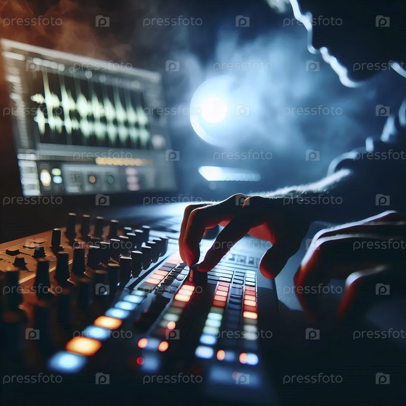 Музыкант теряет себя в творческом потоке во время сочинения на цифровой аудиорабочей станции, Ai generated image