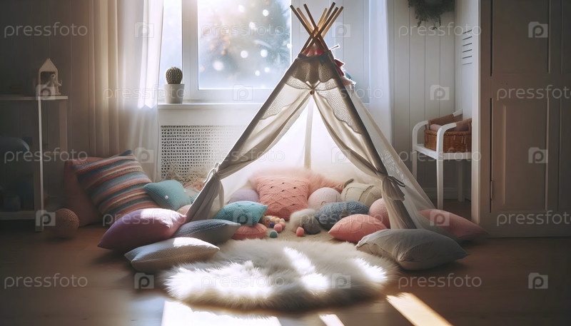 Капризный, солнечный уголок для чтения в детской комнате с типами и плюшевыми подушками, Ai generated image