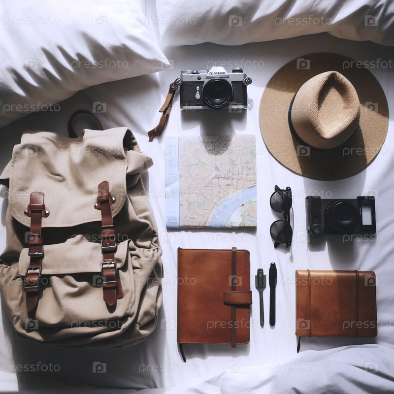 Необходимое оборудование для туристов, выложенное на кровать в общежитии перед днем исследования: карта, шляпа, журнал, бутылка с водой, изображение AI