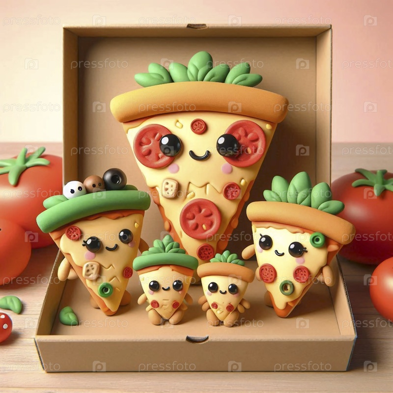 Каваи-сцена семьи с кусочками пиццы, Ai generated image