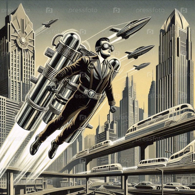 Личный пассажирский самолетный пакет взлетает между монолитными небоскребами в ретро-футуристическом мегаполисе, Ai generated image