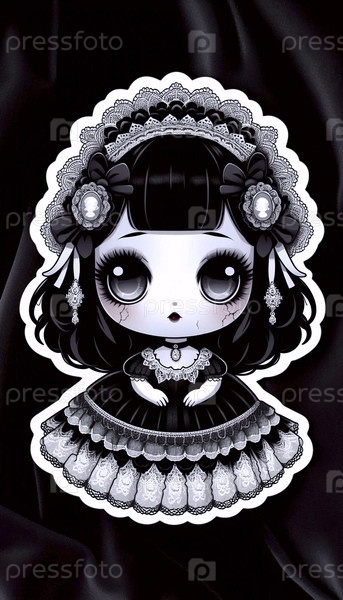 Милый стикер кавайи на готическую фарфоровую куклу Лолита, Ai generated image