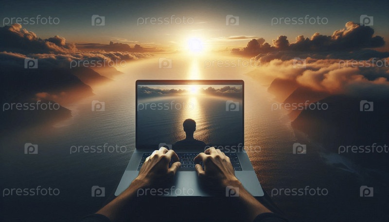 Силуетизированный цифровой номад работает с прибрежного коворкинг-пространства на рассвете, Ai generated image