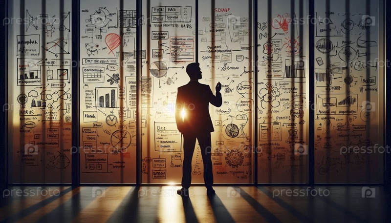 Вдумчивый лидер разрабатывает стратегию, в то время как пишет на стеклянной стене, заполненной схемами и целями