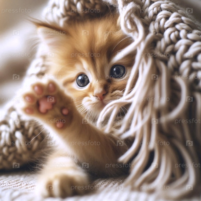 Мягкий оранжевый котенок, играющий своей крошечной лапой в углу вязаного одеяла, создал изображение