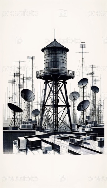 Водная башня на крыше и спутниковые тарелки чернила рисунок художественная печать, Ai generated image