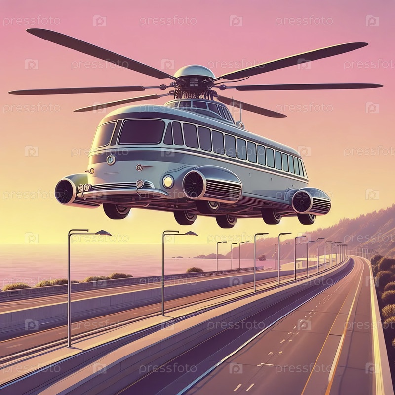 Шпионский автобус для пригородного транспорта с роторами, летящий над узкой прибрежной автомагистралью на закате, Ai generated image
