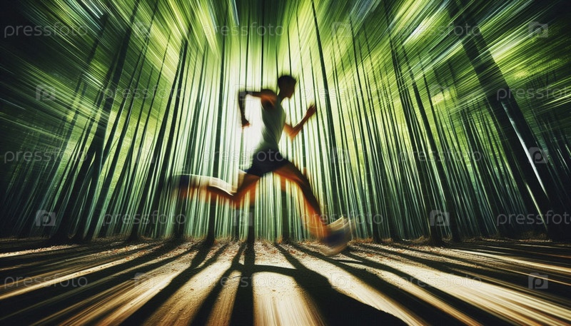 Бегущий по тропе в плавном движении на узкой дорожке через густой, зеленый бамбуковый лес Ai generated image
