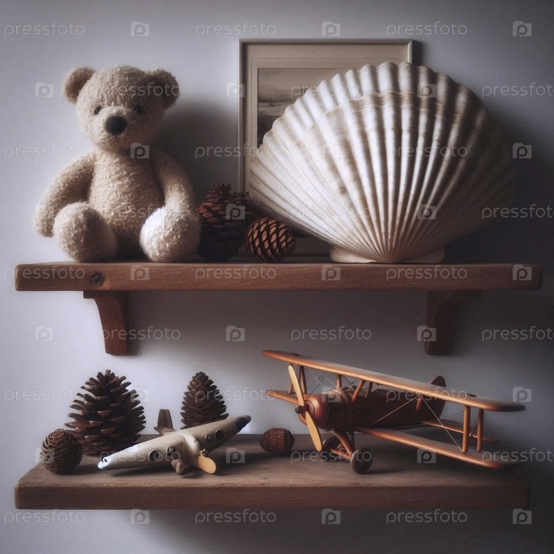 Плавучая полка с драгоценными сокровищами детства: раковина, сосновый конус, модель самолета, Ai generated image