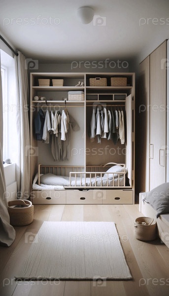 Низкая кровать вдохновлена Монтессори и доступный гардероб, поощряющий независимость ребенка, Ai generated image