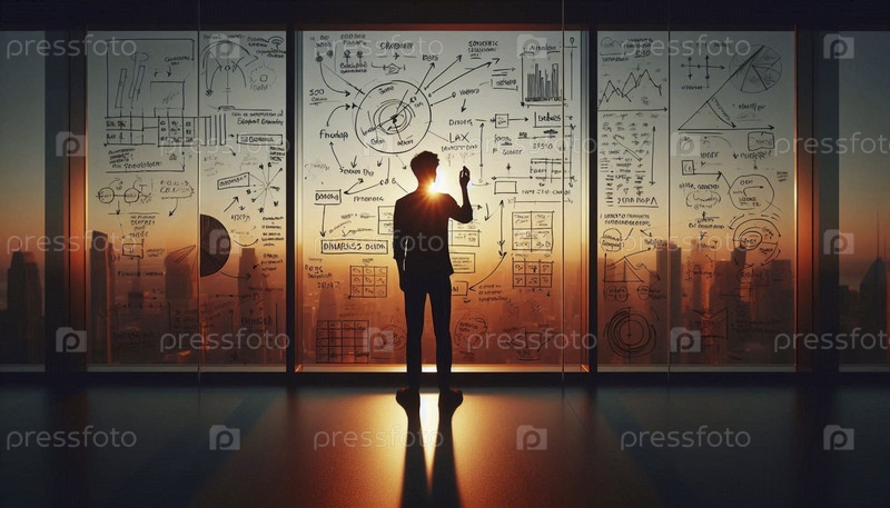 Вдумчивый лидер разрабатывает стратегию, в то время как пишет на стеклянной стене, заполненной схемами и целями